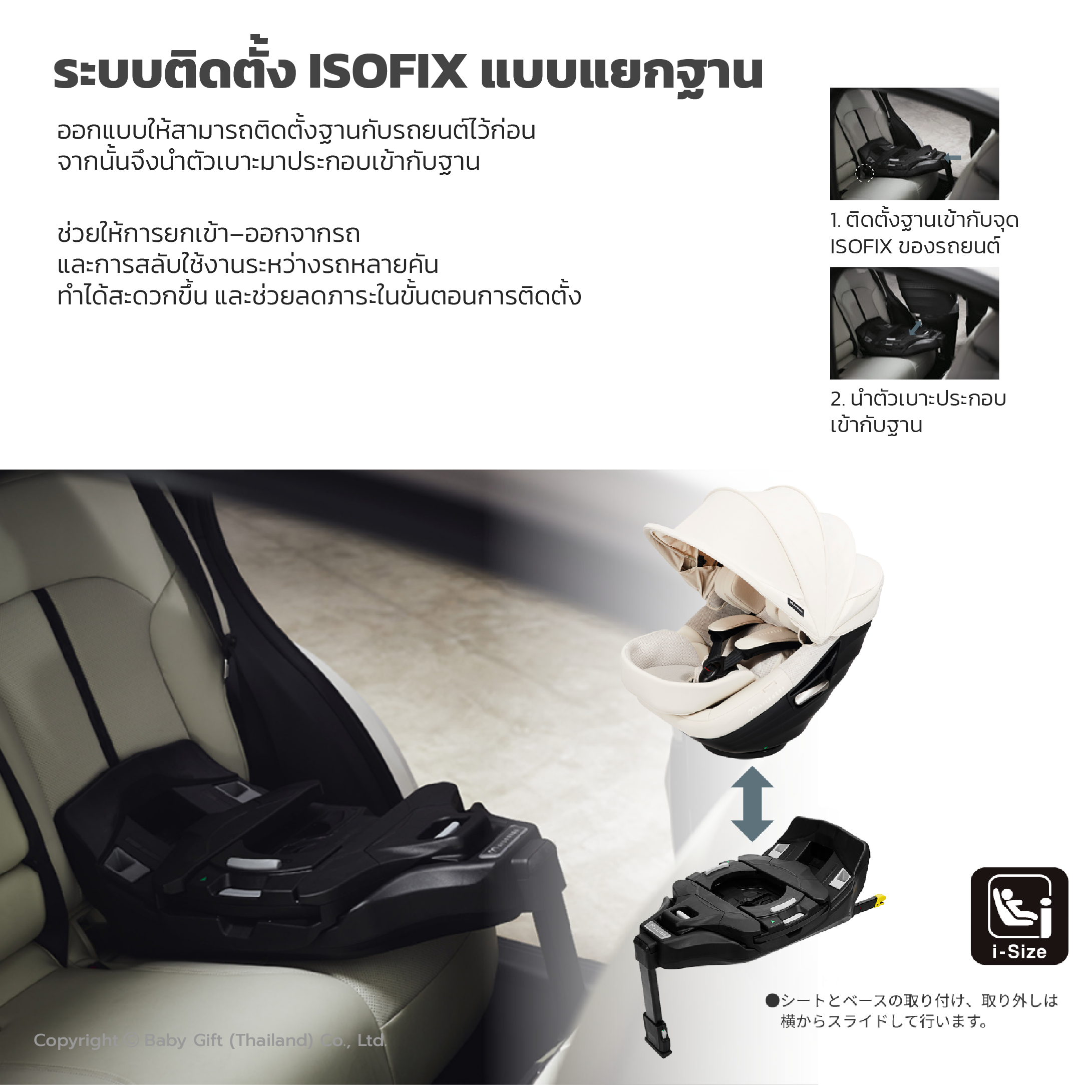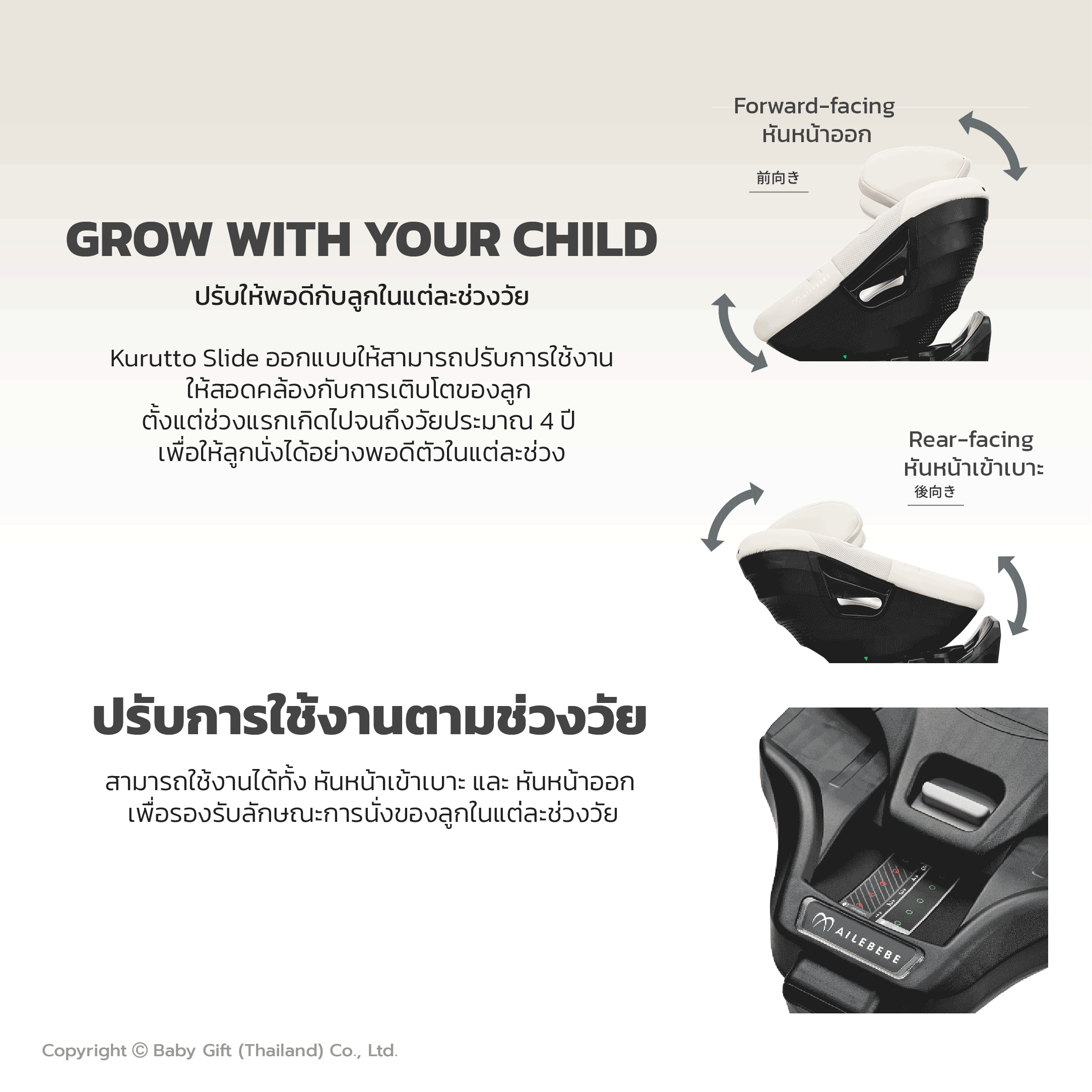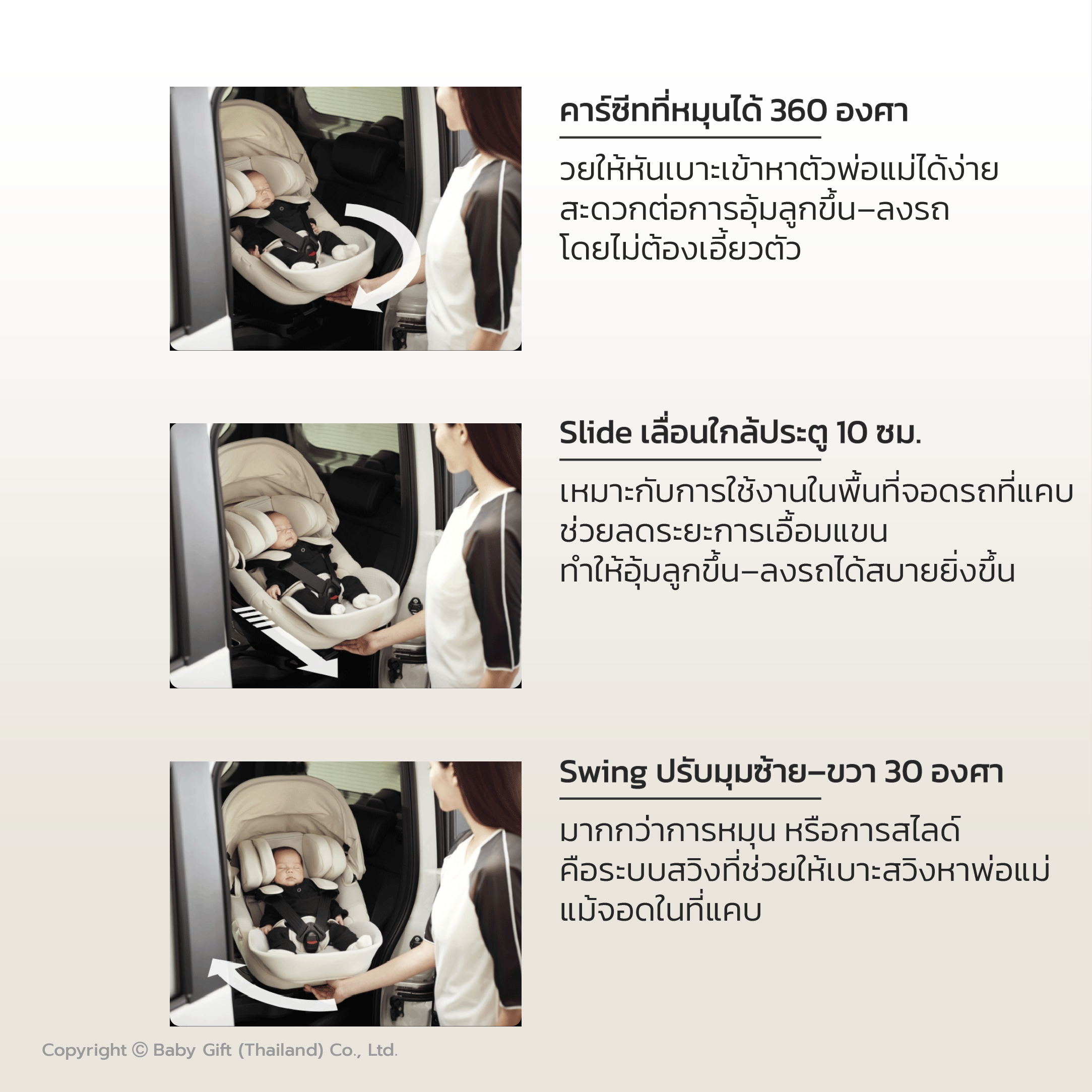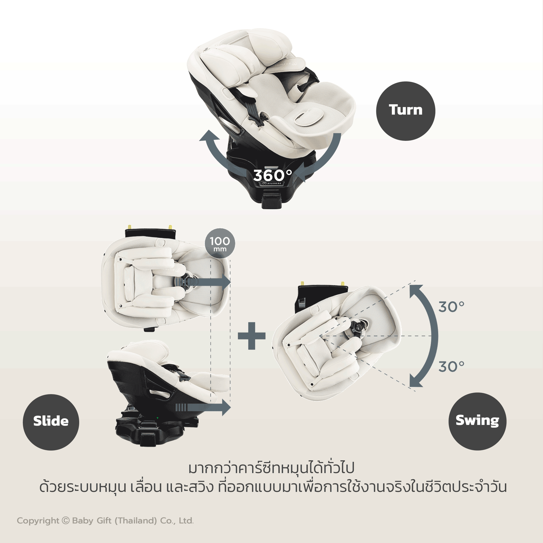 คาร์ซีทหมุนได้ทั่วไปช่วยให้หันเบาะเข้าหาประตู แต่ Kurutto Slide ถูกคิดต่ออีกขั้น—เบาะสามารถ Slide และ Swing เข้าหาพ่อแม่ ช่วยลดการยกและการบิดตัวตอนอุ้มลูก ซึ่งเป็นจุดที่พ่อแม่ต้องเจอทุกวันจริง ๆ