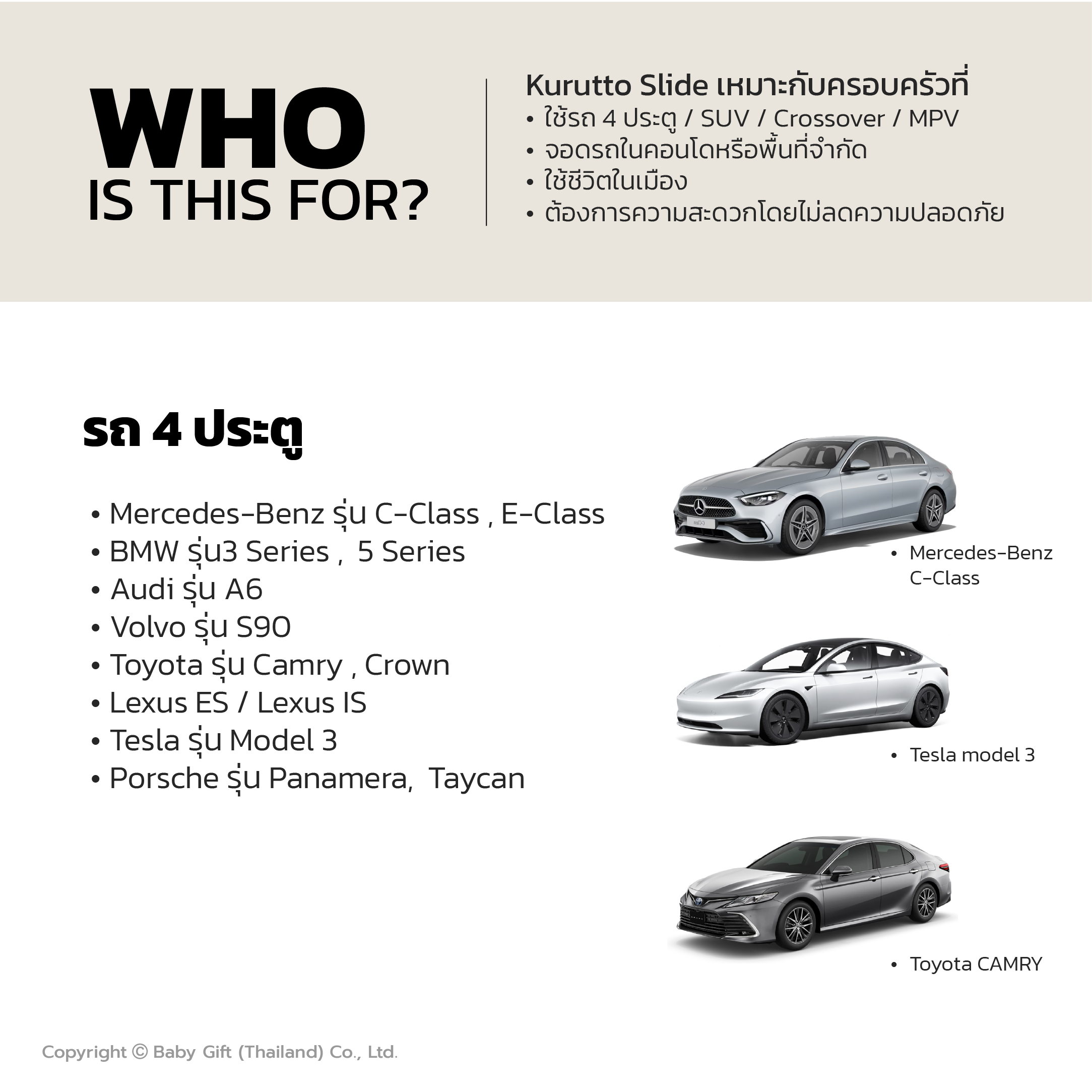 Kurutto Slide รองรับรถที่มีระบบ ISOFIX ตามมาตรฐาน หากเปลี่ยนรถ สามารถนำรถเข้ามาให้ทีม BabyGift ช่วยตรวจเช็กการติดตั้ง เพื่อใช้งานได้อย่างถูกต้องและปลอดภัยต่อเนื่อง