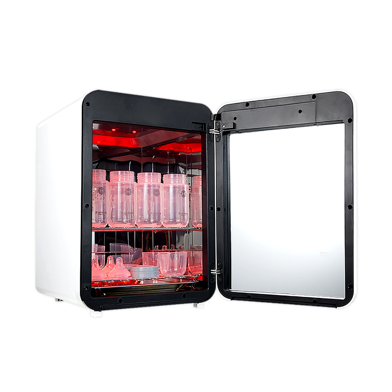 A: แสง UV - C จะทำงานเฉพาะภายในตัวเครื่องเท่านั้น ตัวเครื่องเป็นระบบปิด มีบานประตูแม่เหล็กแบบสูญญากาศ ปิดแนบสนิทจะไม่ปล่อยแสงออกมาภายนอก และไม่ก่อให้เกิดโอโซน จึงปลอดภัยต่อการใช้งานในบ้านที่มีเด็กเล็ก