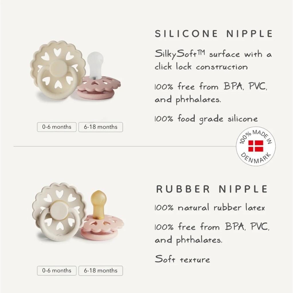 จุกนมยาง FRIGG Fairytale ได้รับการออกแบบอย่างพิถีพิถันเพื่อความสบายของลูกน้อยด้วยยางธรรมชาติและคุณสมบัติผ่อนคลาย