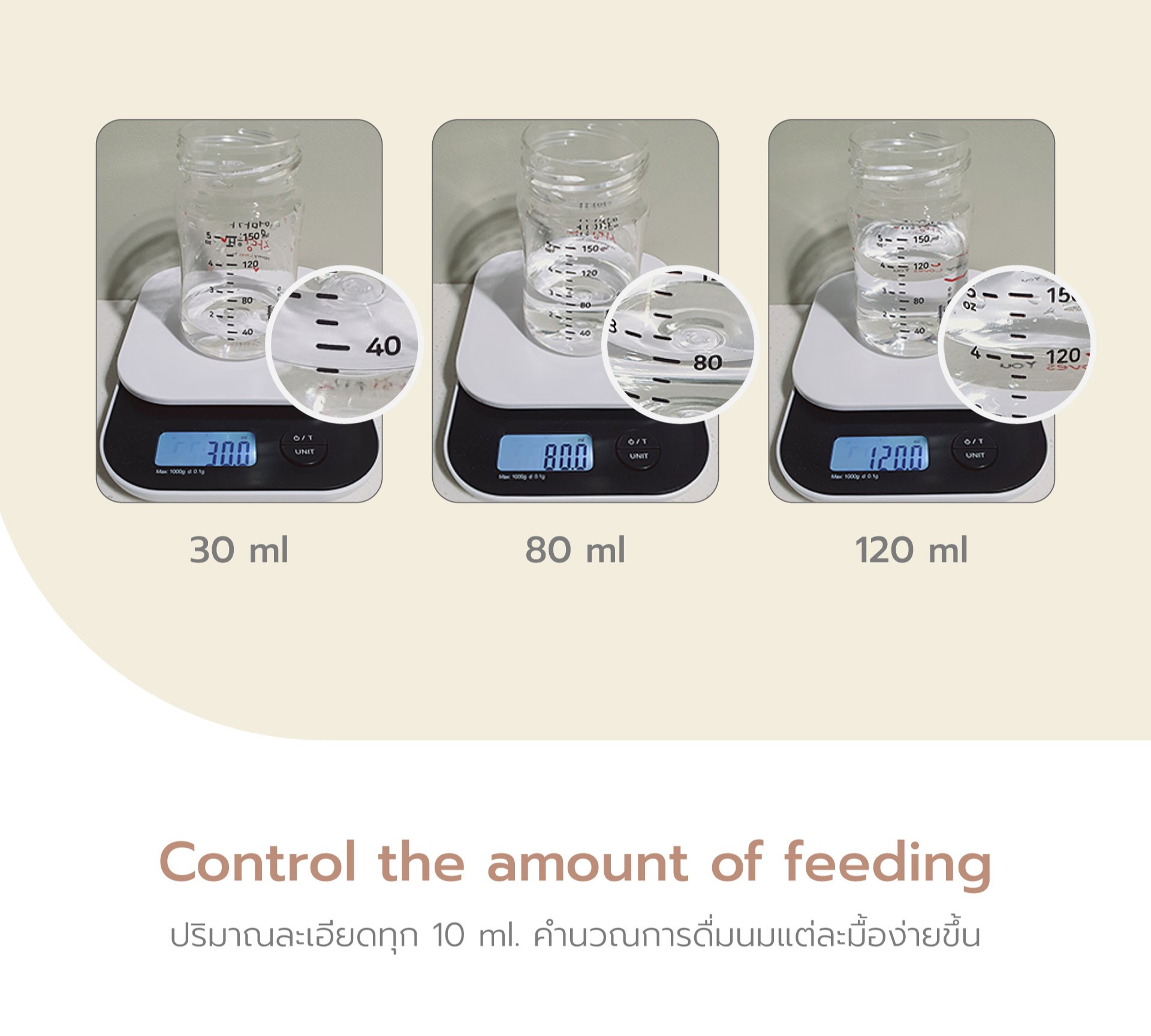 ขีดปริมาณละเอียดทุก 10 ml. คำนวณการดื่มนมแต่ละมื้อง่ายขึ้น