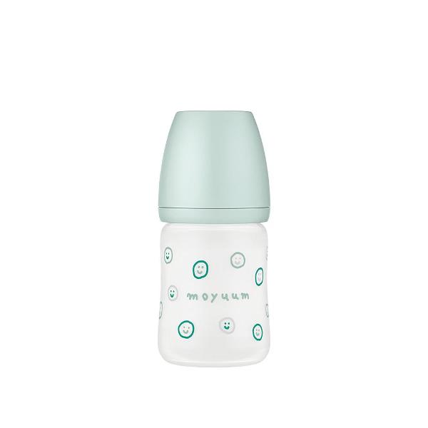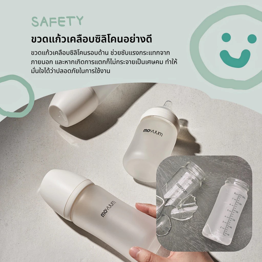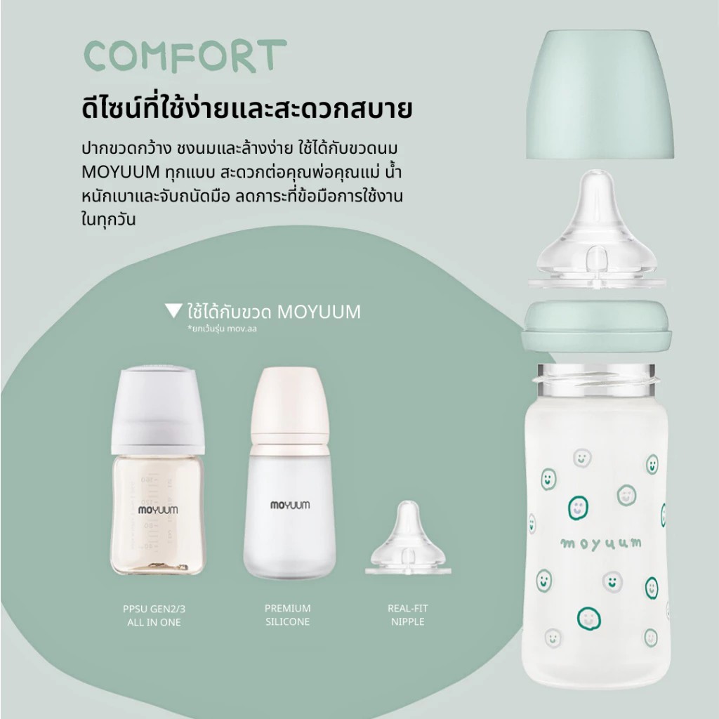 MOYUUM ขวดแก้วเคลือบซิลิโคน ลาย Happy More 150ml พร้อมจุก Real-Fit Stage 1 (0-3m)