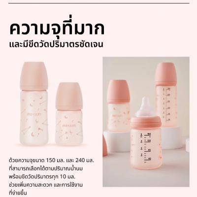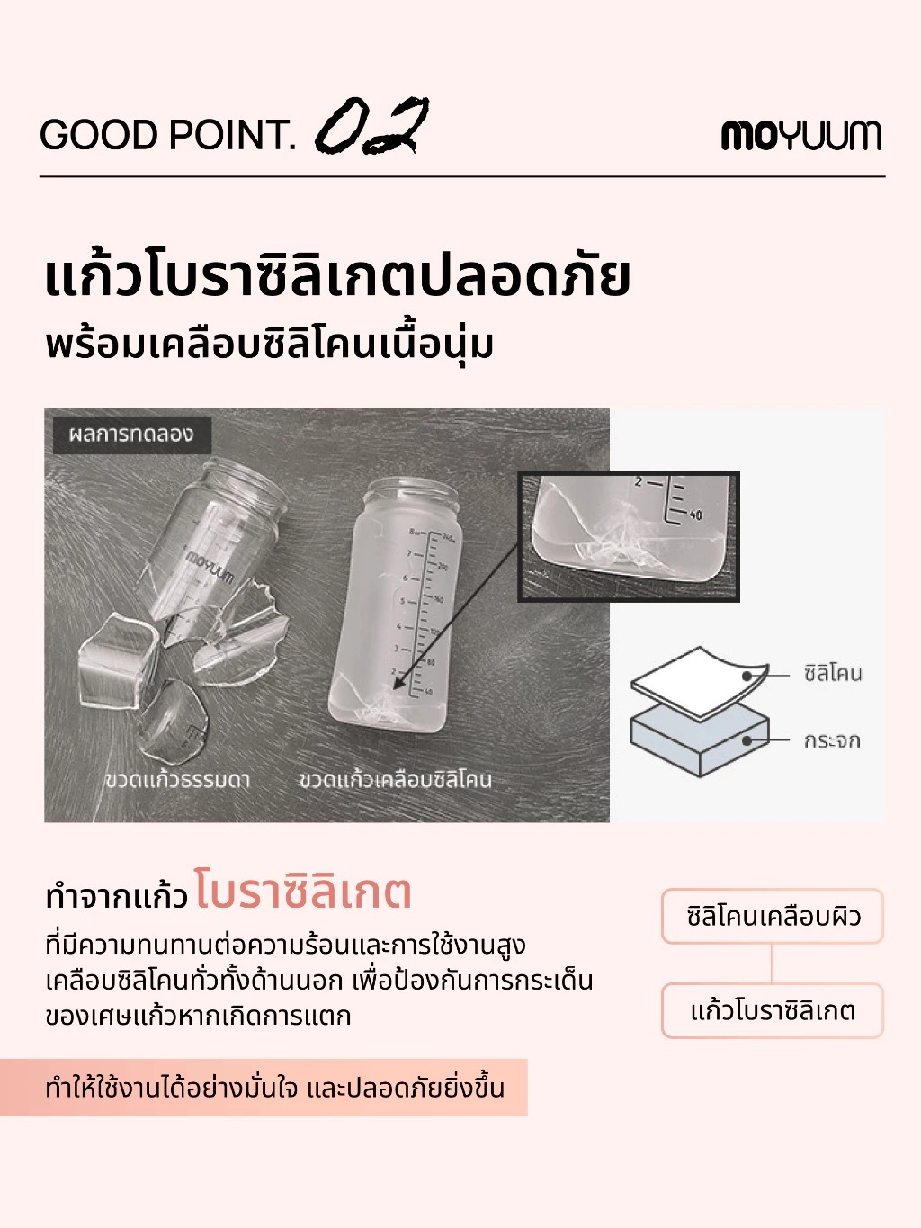 ขวดแก้วทำจาก โบราซิลิเกต ที่มีการทนทานติ่อความร้อนสูง เคลือบซิลิโคลนทั่วทั้งด้านนอก เพื่อป้องกันการกระเด็นของเศษ แก้ว