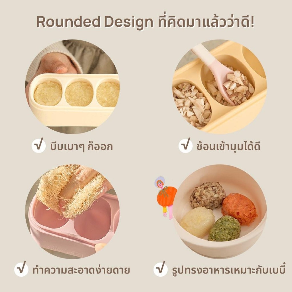 Rounded Design : หมดปัญหาแกะอาหารฟรีซไม่ออก ด้วยดีไซน์กลมมนช่วยให้บีบออกภายใน 1 วินาที ทั้งทำความสะอาดได้ทุกมุม รูปทรงอาหารที่ได้ก็เหมาะกับการฝึกทานของเบบี๋