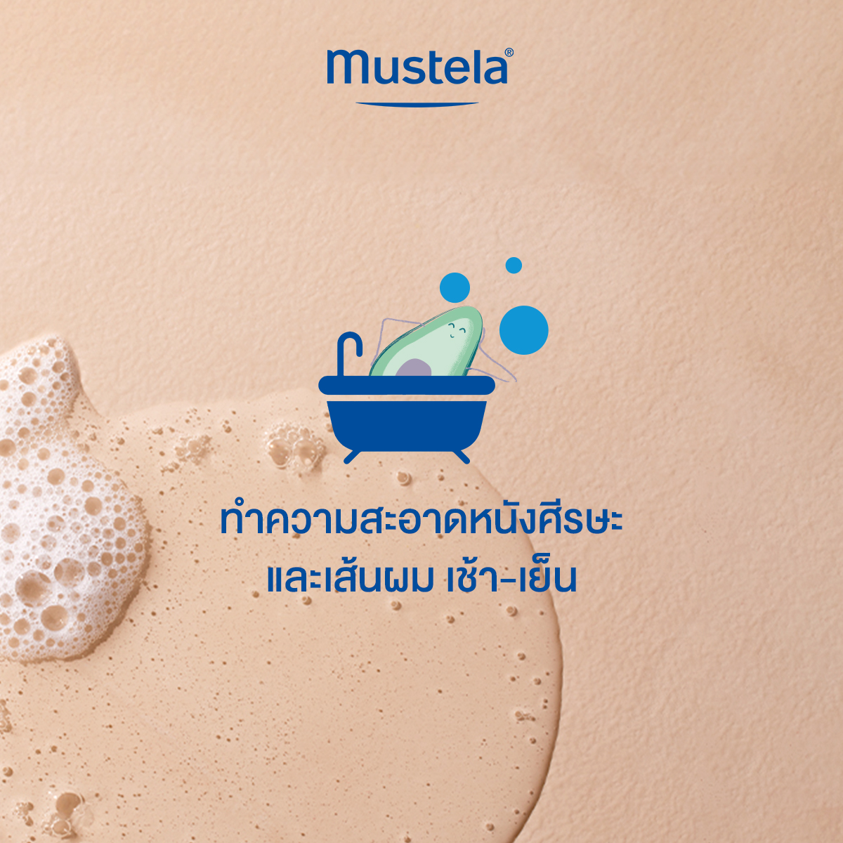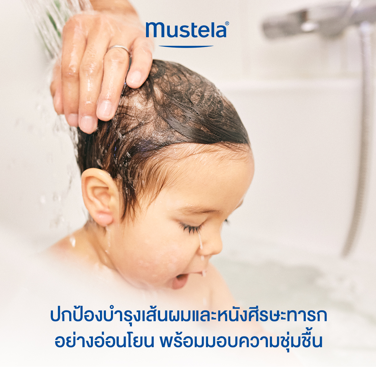 ชโลมแชมพูเล็กน้อยบนผมเด็กที่เปียก นวดเบาๆแล้วล้างออก